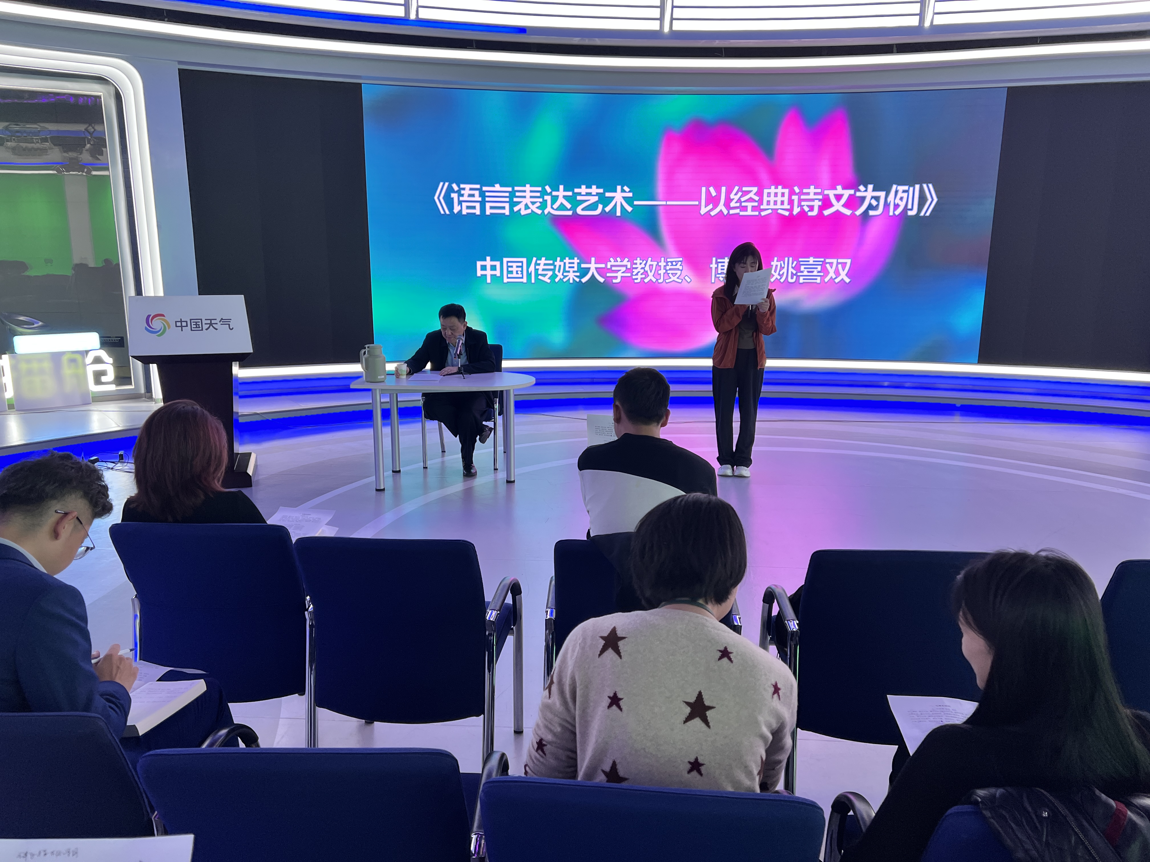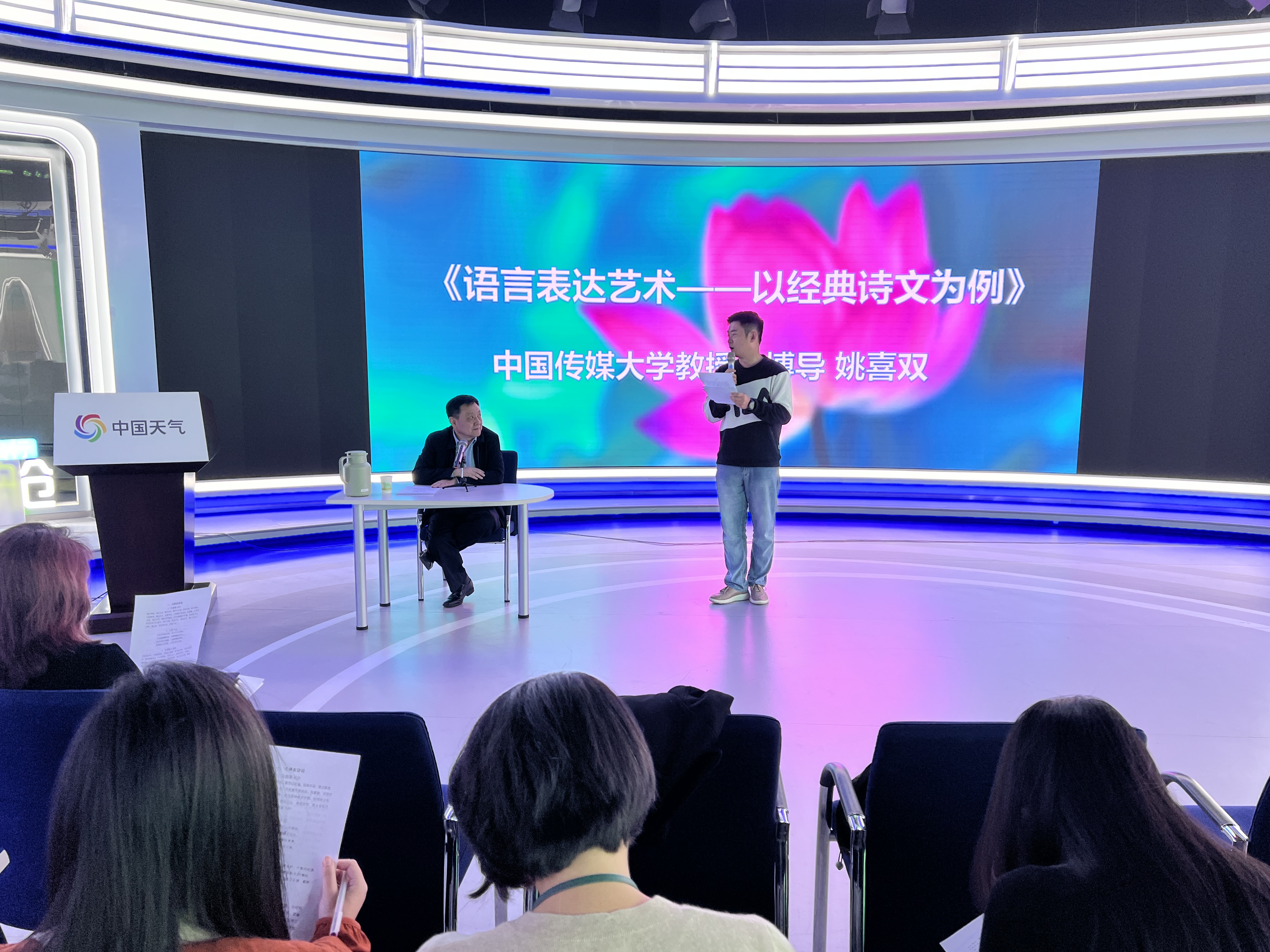 姚教授以"经典诗文中的语言艺术"为切入点,带领学员深入毛泽东《沁园春·长沙》《七律·长征》《水调歌头·游泳》《贺新郎·读史》及范仲淹《岳阳楼记》等不朽篇章。他不仅剖析了诗词中的意象构建与情感表达,更现场指导学员朗诵实践,从吐字归音到情感把控,从节奏韵律到意境营造,将"先天下之忧而忧,后天下之乐而乐"的家国情怀,"问苍茫大地,谁主沉浮"的历史担当,通过声音艺术传递给当代受众。姚教授强调,在信息爆炸的新媒体时代,语言表达不仅是技术,更是思想的载体、文化的传承,气象主持人应当以"言为心声"的态度,将专业气象知识转化为有温度、有深度、有高度的视听语言,在"字正腔圆"中彰显文化自信,在"声情并茂"中传递科学精神。