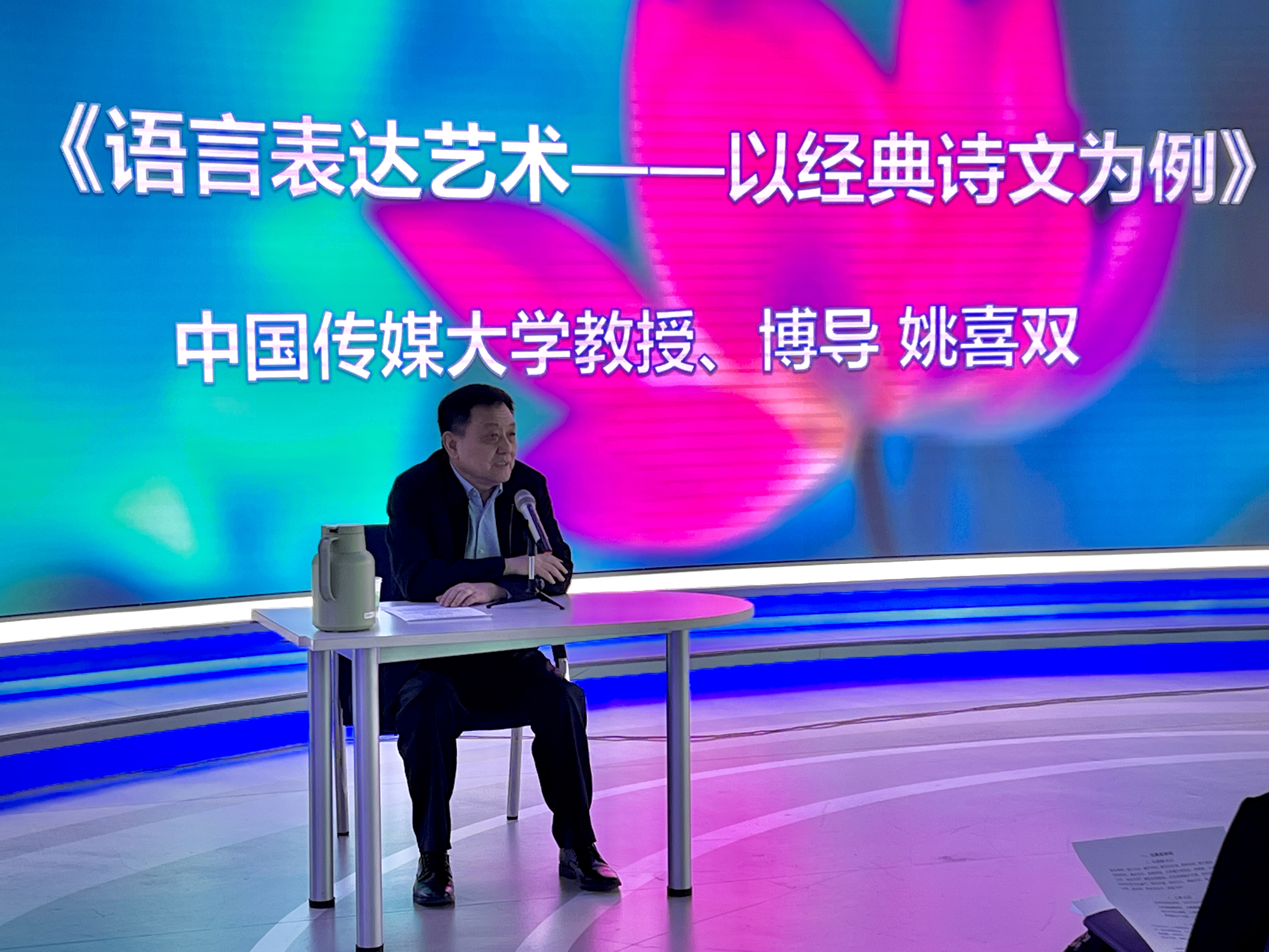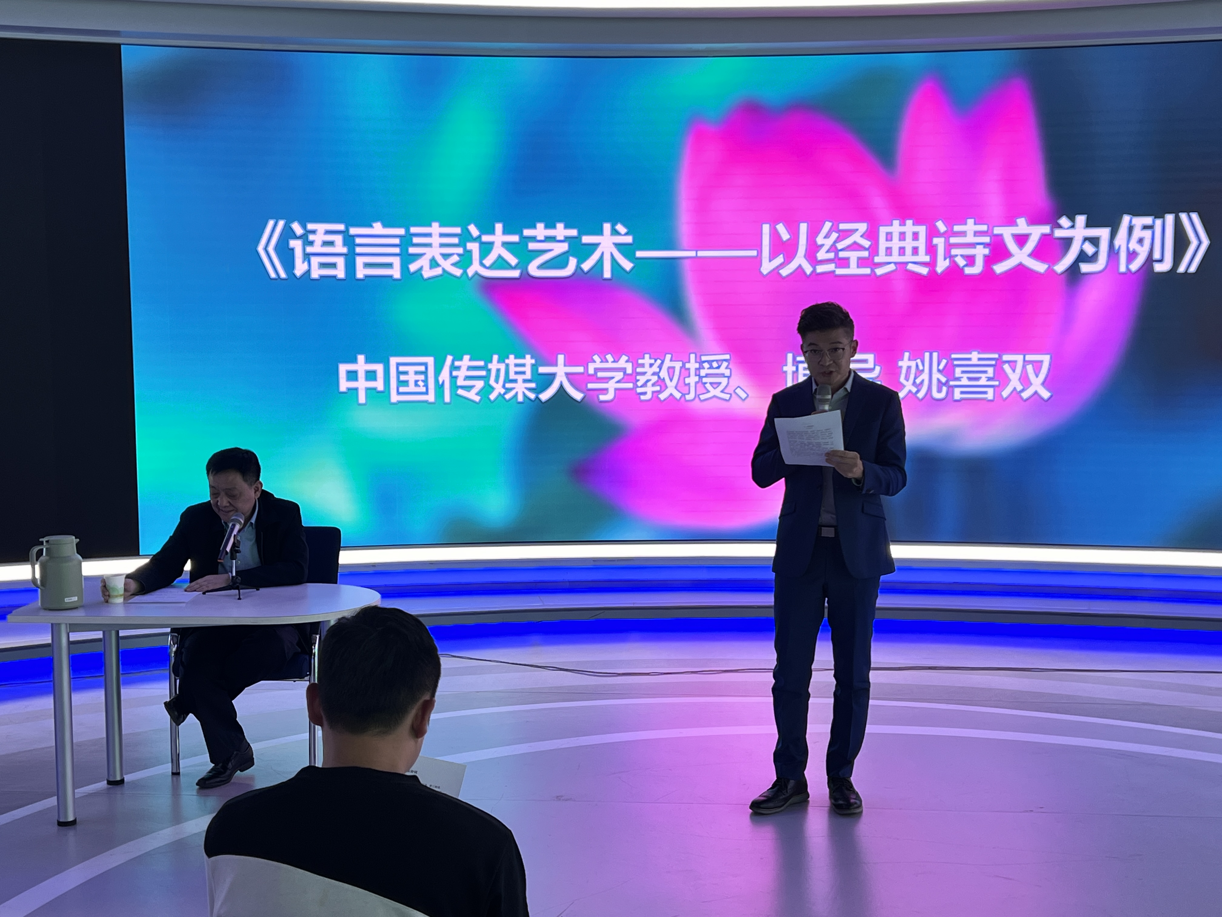 10月17日,华风集团出镜人才培养计划第五期课程在集团109融媒体演播室精彩开讲。全媒体运营中心品牌形象管理中心特邀播音界殿堂级前辈,中国传媒大学教授、博士生导师姚喜双,为集团出镜人才带来《语言表达艺术——以经典诗文为例》的专题培训。集团党委常委、副总经理白金莅临指导。